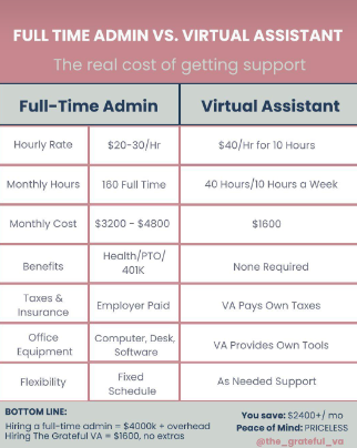 Let’s explore the difference between hiring a full-time administrative assistant versus partnering with a virtual assistant (like me!).